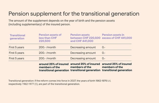 2. Additional pension: A pension top-up is planned for the 15 years following introduction of the reform, to compensate for the reduction in the conversion rate for people close to retirement. This supplement, the cost of which is estimated at about CHF 800 million, will be financed by the Guarantee Fund, which will be financed by contributions from pension funds.